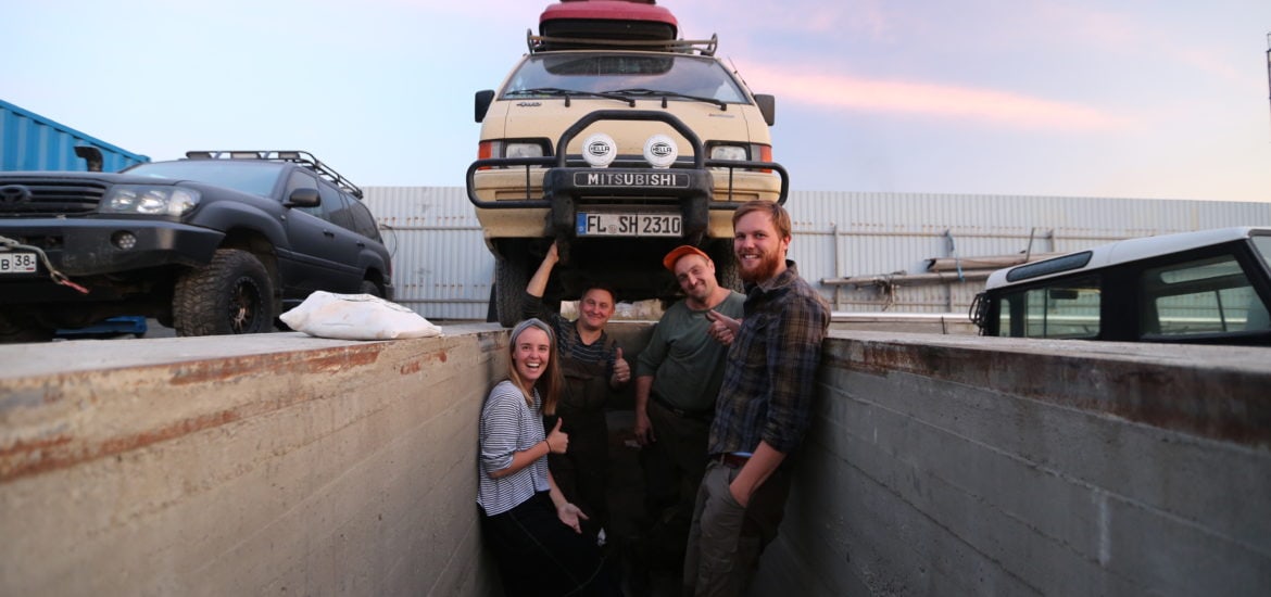 Mit einem richtig dicken Kopf wachen wir am nächsten Morgen auf und katern uns durch den Tag, bis wir wieder von Sascha und Pascha hören. Wir können wieder längskommen, das Teil sei gewechselt. Yandex-Taxi und ab dafür! Ich springe auf den Fahrersitz, lasse den Motor an und es kommt, wie es kommen muss: das Knacken ist weiterhin zu hören. Den Mechanikern steht das Entsetzen ins Gesicht geschrieben und der Anflug von Ratlosigkeit wird durch schlagartigen Aktionismus weggewischt. Also, alle Mann unter den Wagen und alle Teile angreifen, die mit dem Allradantrieb zu tun haben und irgendwie klappern könnten. Zwischenzeitlich nehmen wir mit Roman zuhause Kontakt auf, der uns Mushi damals verkauft hatte. Roman hat unser volles Vertrauen in Sachen Autos und Mechanik, besonders wenn es um den L300 geht. Ein Glück, Roman spricht fließend Russisch! Ich übergebe das Telefon an Pascha und schon tauschen die beiden sich aus und Roman legt noch ein richtig gutes Wort für uns ein. Sascha und Pascha sind absolut gepusht und die ganze Truppe fährt an ein nahes Flussufer, um der Ursache im weichen Flussbettsand auf den Grund zu gehen.